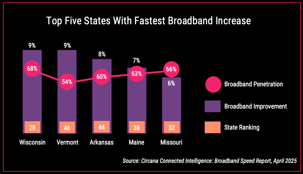 More significant than the national improvements are the states that are seeing the greatest improvement as these are some of the more poorly penetrated markets. We can thank infrastructure buildouts (both fixed, cable solutions such as fiber, as well as fixed wireless access) with physical cable rollouts benefiting from the BEAD (Broadband Equity, Access and Deployment) initiative.