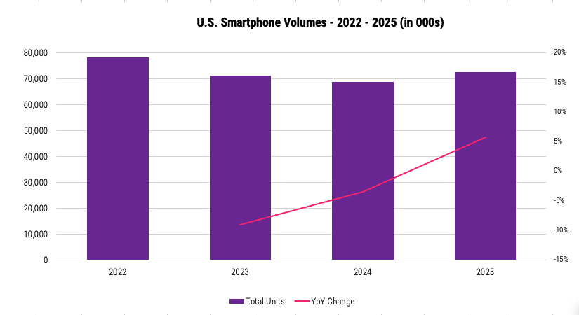 In 2025, new U.S. smartphone sales reversed the multi‑year pattern of declines, delivering the strongest annual performance since before the pandemic. Total volumes rose 6% year-over-year, a notable turnaround from the close to double‑digit drops seen in 2023 and 2024. This rebound aligns closely with expectations set throughout 2024, when the average smartphone age hit an all‑time high and signaled an inevitable wave of deferred replacements coming back into the market.