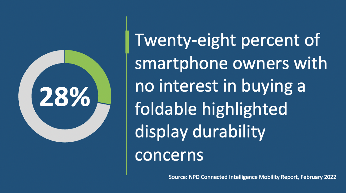 - The improvement of the display’s durability and Samsung’s effective marketing by quantifying the improvement (“45% more durable”) are important highlights as the display’s resilience is an important decision-making factor when purchasing a foldable smartphone. According to the NPD Connected Intelligence Mobility survey, 28% of smartphone owners who showed no interest in purchasing a foldable smartphone claimed that they were concerned about the display’s durability.