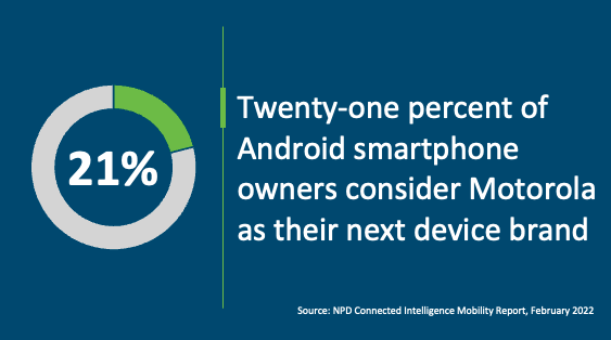 • Motorola has done a remarkable job of filling in the shoes of LG, which has exited the market a year ago, and it has a solid number two position in Android volumes thanks to its strong sub-$300 device lineup. According to NPD’s Connected Intelligence Mobility survey, 21% of Android smartphone owners consider Motorola as their next device brand.
