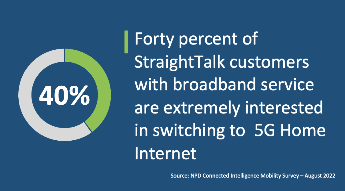- Verizon’s debut of a prepaid 5G Home Internet service under the StraightTalk should help boost the carrier’s FWA user base, considering the prepaid brand’s positioning and large base at Verizon. According to the latest NPD Connected Intelligence Mobility survey, StraightTalk customers significantly over-index in interest for affordable 5G Home Internet solutions as a cable Internet alternative (40% of StraightTalk customers who have cable Internet subscriptions are “extremely” interested in switching to a 5G Home Internet service versus 24% t0 31% extreme interest at rival prepaid carriers).