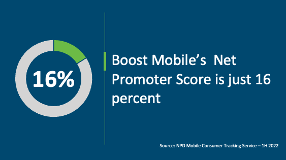 - Dish Network is tasked with reaching a 70% POP infrastructure coverage by June 2023 and has been putting all its focus on meeting this network buildout deadline, while formulating a postpaid service (Boost Infinite) that would run on this new 5G network. As Dish (rightfully) allocated its limited resources to this network/postpaid service build out, the Boost Mobile prepaid operation had little to work with in an extremely competitive prepaid market driven by the three big carriers with deep pockets. Boost Mobile typically fails to match competition in device selection and subsidies and has the lowest Net Promoter Score (NPS) among all tracked carriers in NPD’s Mobile Consumer Tracking database.