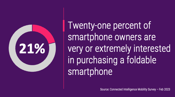 - While consumers show high interest in foldables smartphones (according to the latest Circana Mobile Connectivity survey, 21% of smartphone owners are either very or extremely interested purchasing a foldable smartphone), Apple’s commanding market share, especially among the high-income segment who can afford foldables, is a major barrier in adoption. Nevertheless, of the few iOS churners who switched to the Android platform for their latest smartphone, 10% of them did so for the foldable form factor offered by Samsung.