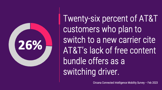 - The rise in AT&T’s Q2 churn is not surprising as Circana Connected Intelligence has been reporting on this expected incidence due to our latest data cited a growing number of AT&T customers planning to jump ship. As the AT&T CFO highlighted, this behavior is driven by rivals’ aggressive prices, though many of these elusive AT&T customers have reported that the carrier’s lack of free content bundle offers is an important churn driver.