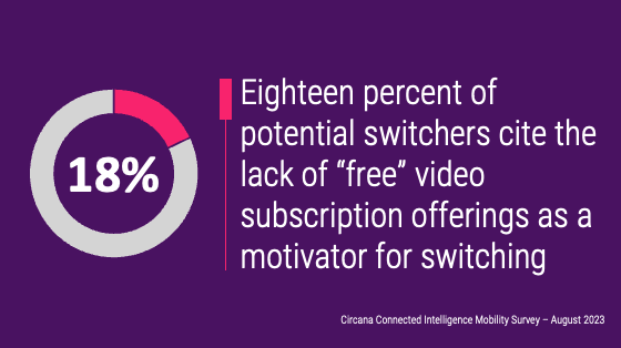 - The addition of the new Netflix-Max bundle to Verizon’s a-la-carte $10/month content list solidifies Verizon’s lead in terms of the breadth of the content library offered by any other mobile carrier. On the other hand, despite the simplicity of the service and pricing structure, the per service fee theme may be a turn off for many U.S. customers who are accustomed to receiving these content subscriptions free of charge from their mobile carriers. According to the Connected Intelligence Mobility survey, 18% of potential switchers cite the lack of “free” video subscription offerings by their current provider as a motivator for seeking alternative service providers.
