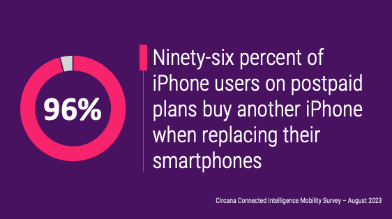 - Postpaid carriers’ aggressive deals should also help accelerate the upgrade cycle for Samsung, which, just like any other smartphone brand, has suffered from consumers’ reluctance in replacing their smartphones. Samsung is poised to see strong demand from its existing base as well as from older flagship users on competing brands such as Google or OnePlus. On the other hand, winning business from iOS users will be as challenging as ever despite the great hardware and software combination of the S24 as postpaid iPhone users show a whopping 96% loyalty rate and do not defect to Android.