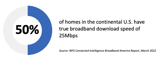 - According to NPD’s new Broadband America report, only 50% of homes in the continental U.S. have true broadband download speed of 25Mbps whereas T-Mobile’s 5G FWA solution promises consistent three-digit downloads speeds in the areas it provides coverage. The speed advantage coupled by the attractive monthly cost (with respect to fixed broadband solutions from cable rivals) should help T-Mobile grow its FWA base fast.