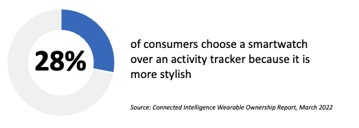 • Style is an important factor for consumers when choosing a smartwatch, with 28% of consumers choosing a smartwatch over an activity tracker because they consider smartwatches more stylish. Conversely, 19% choose a tracker over a smartwatch for the very same reason, highlighting that beauty is, indeed, in the eye of the beholder.
